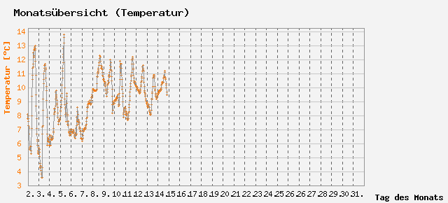 Schnitt: 8.989 °C; Min: 3.6 °C; Max: 13.8 °C