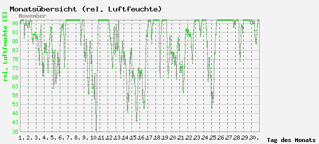Die letzte Spalte zeigt die Qualität der Funkverbindung zu den Außensensoren an: "?" deutet Schwierigkeiten bei der Datenübertragung an. Die Daten wurden aber vollständig übertragen! "!" zeigt an, dass mindestens ein Datensatz nicht übertragen wurde und in die Mittelung nicht einbezogen werden konnte (D.h. von mind. einer halben Stunde fehlen alle Werte !).