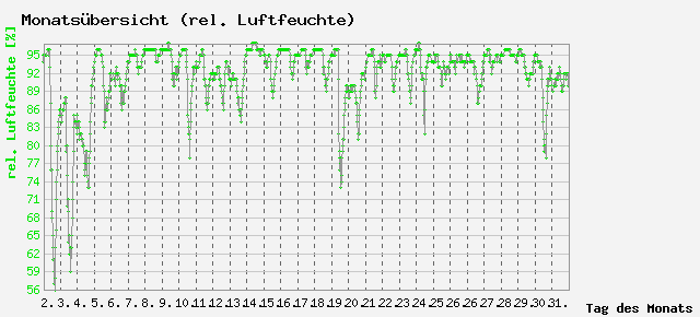 Die letzte Spalte zeigt die Qualität der Funkverbindung zu den Außensensoren an: "?" deutet Schwierigkeiten bei der Datenübertragung an. Die Daten wurden aber vollständig übertragen! "!" zeigt an, dass mindestens ein Datensatz nicht übertragen wurde und in die Mittelung nicht einbezogen werden konnte (D.h. von mind. einer halben Stunde fehlen alle Werte !).